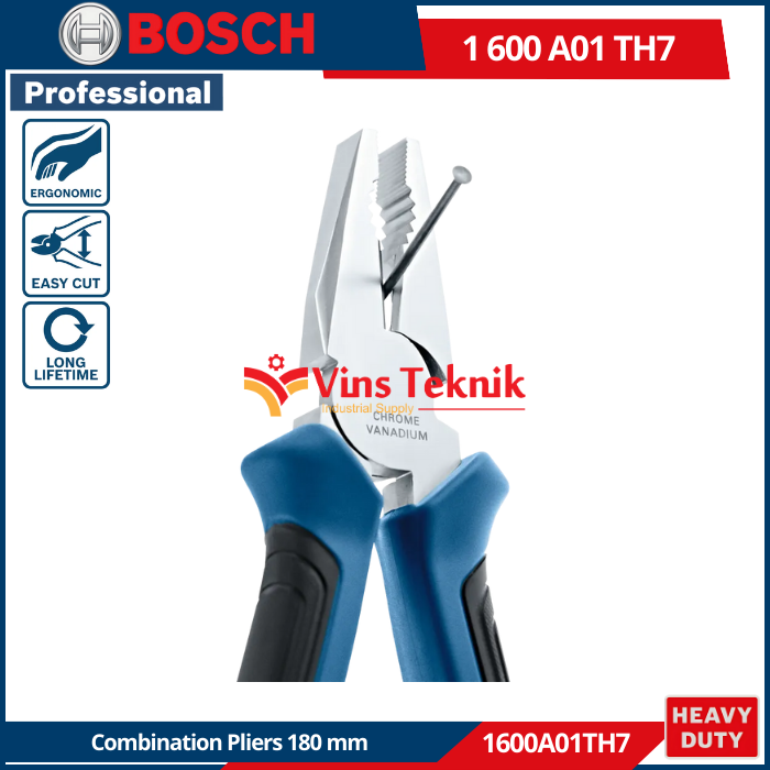 BOSCH 1600A01TH7 adalah tang kombinasi profesional (universal) berukuran 180 mm yang terbuat dari baja vanadium krom berkekuatan tinggi. Tang ini dirancang untuk pekerjaan mencengkeram, memuntir, dan memotong yang kokoh dan tahan lama.