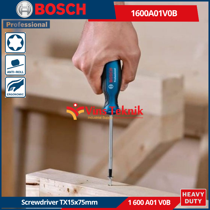 Bosch 1600A01V0B adalah obeng Torx Professional TX15 x 75 mm. Alat ini merupakan varian yang lebih besar dalam lini perkakas tangan Bosch Professional, dirancang untuk memberikan torsi tinggi pada sekrup bintang (Torx).