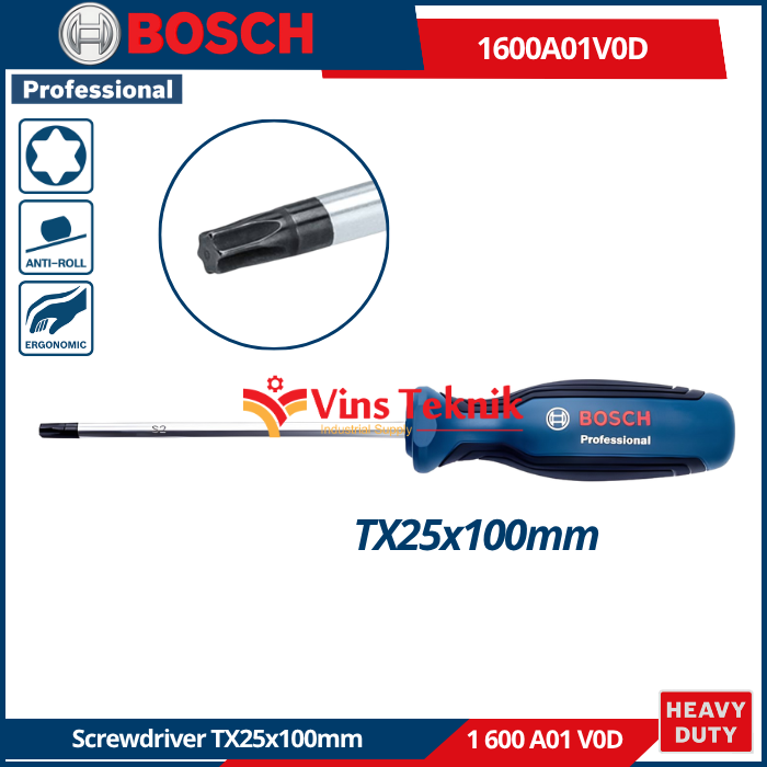 Bosch 1600A01V0D adalah obeng Torx Professional TX25 x 100 mm. Alat ini merupakan varian yang lebih besar dalam lini perkakas tangan Bosch Professional, dirancang untuk memberikan torsi tinggi pada sekrup bintang (Torx).