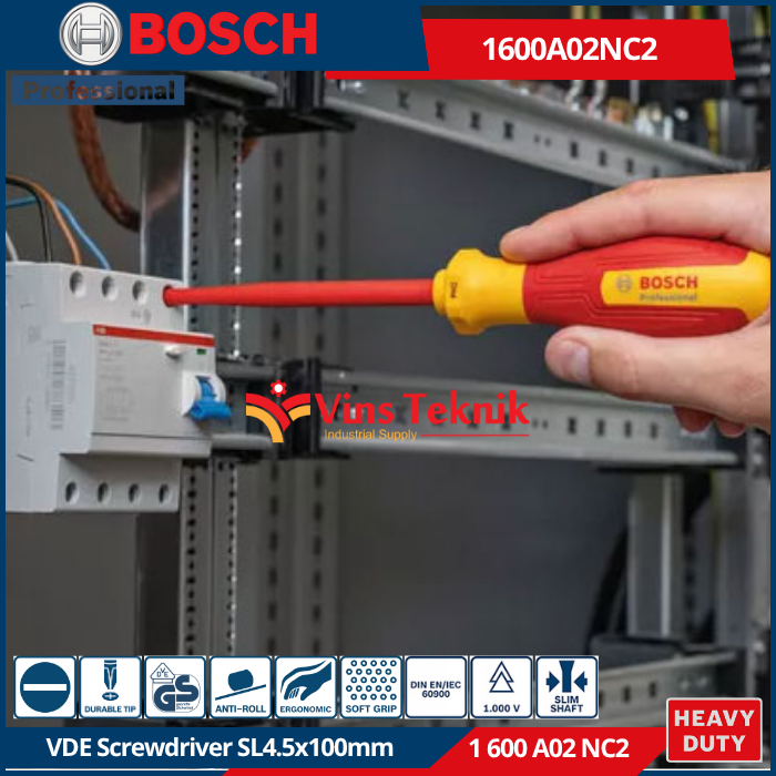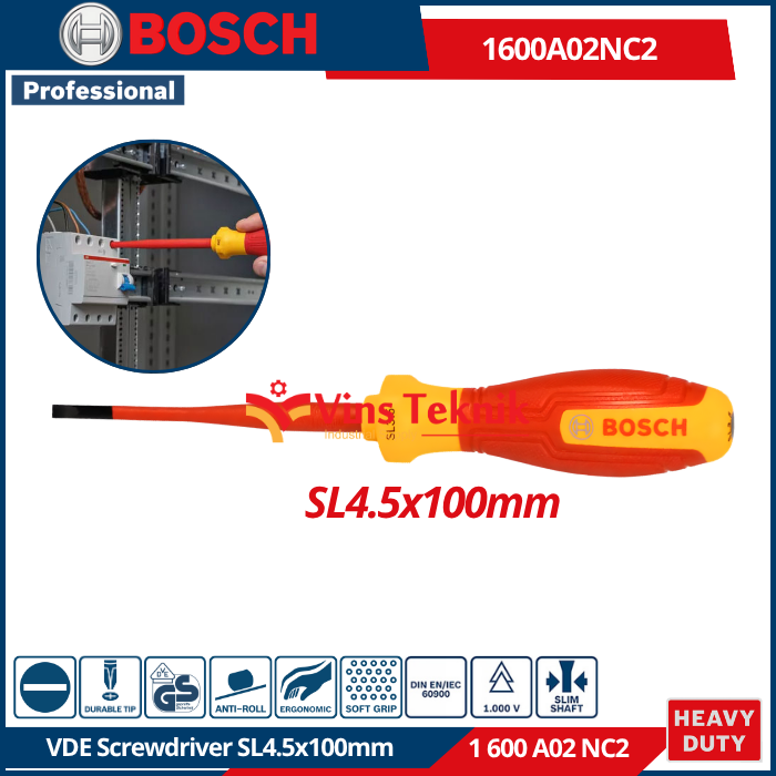 - Anti... Read More Bosch 1600A02NC2 adalah Obeng VDE SL4.5x100 mm Professional. Alat ini merupakan obeng isolasi yang dirancang khusus untuk teknisi listrik agar dapat bekerja dengan aman pada peralatan bertegangan tinggi.
