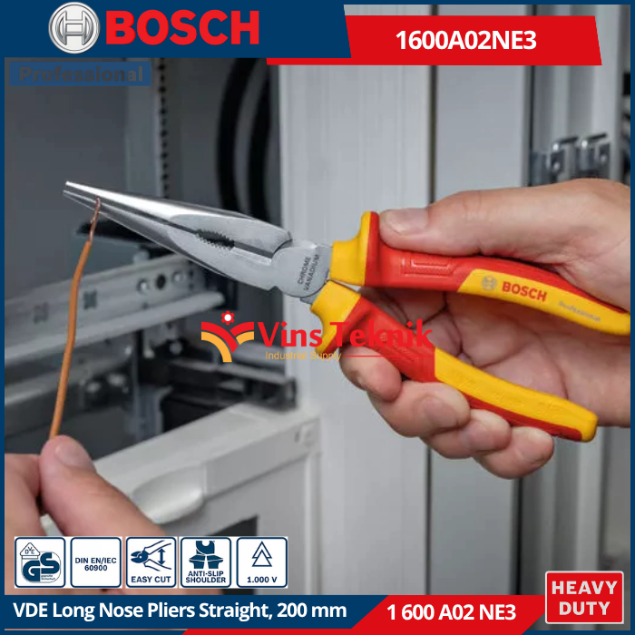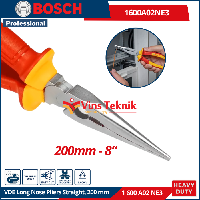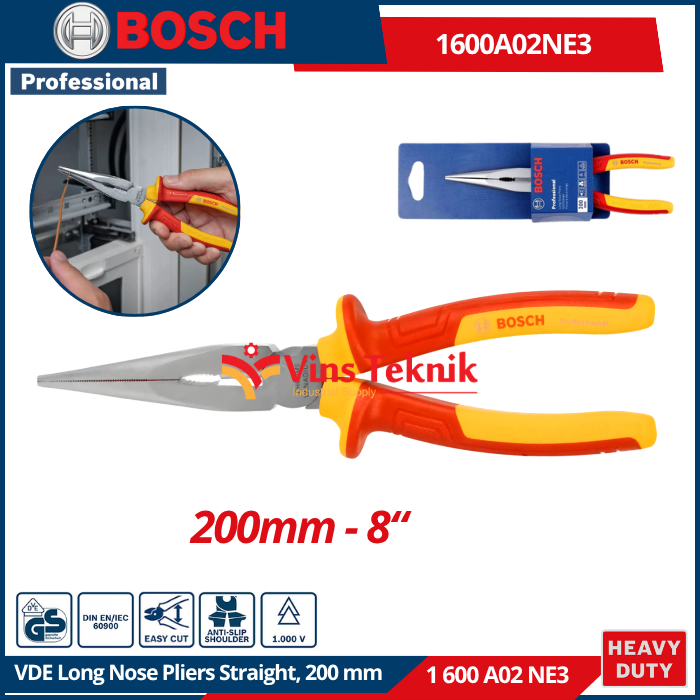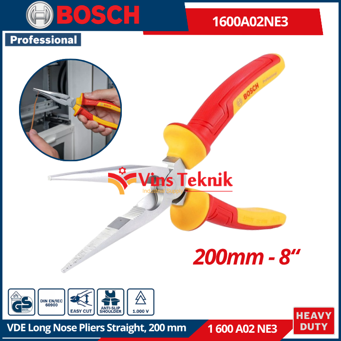 BOSCH 1 600 A02 NE3 adalah kode produk untuk Bosch Professional VDE Long Nose Pliers Straight, 200mm 8Inch.