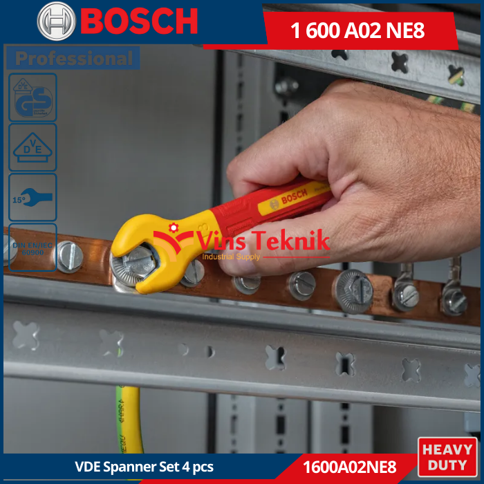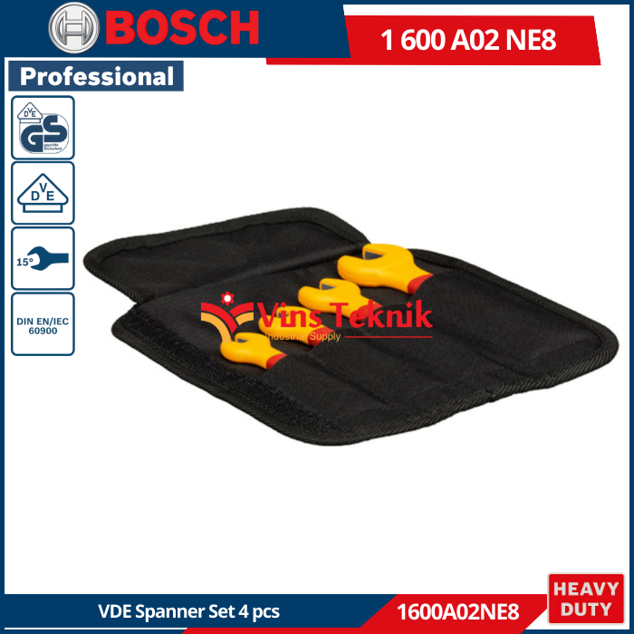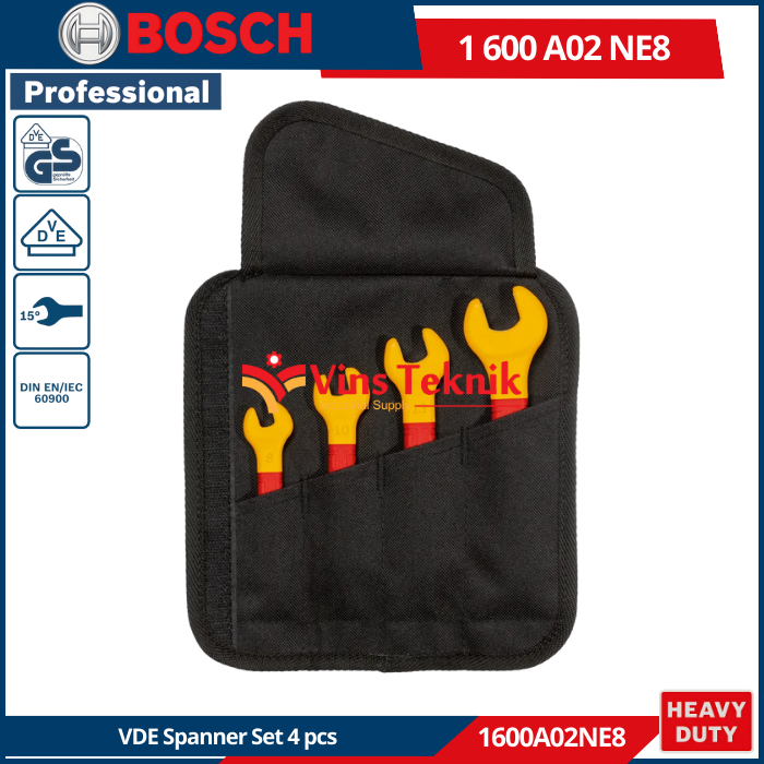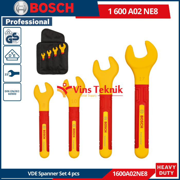 BOSCH 1600A02NE8 adalah set kunci pas ujung terbuka (open-end spanner) VDE profesional berisi 4 buah, yang dirancang untuk pekerjaan yang aman di dekat sirkuit listrik bertegangan.