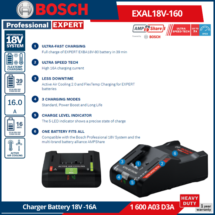 - Kompatibilitas Luas : Pengisi daya ini kompatibel 100% dengan semua baterai Li-ion dalam Sistem Profesional 18V Bosch dan juga aliansi baterai multi-merek AMPShare.