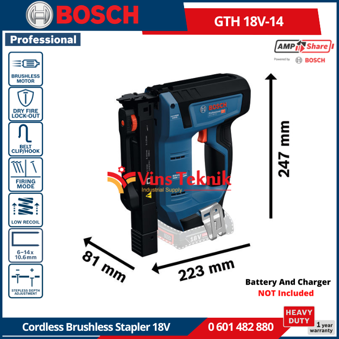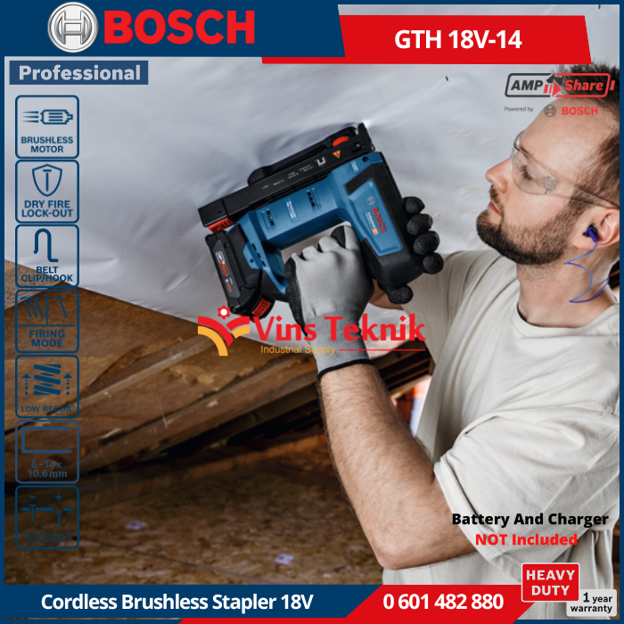 Lampu Kerja LED... Read More Bosch GTH 18V-14 Professional adalah stapler kayu nirkabel yang dirancang untuk kecepatan, presisi, dan kenyamanan pengguna dalam berbagai aplikasi pertukangan dan konstruksi