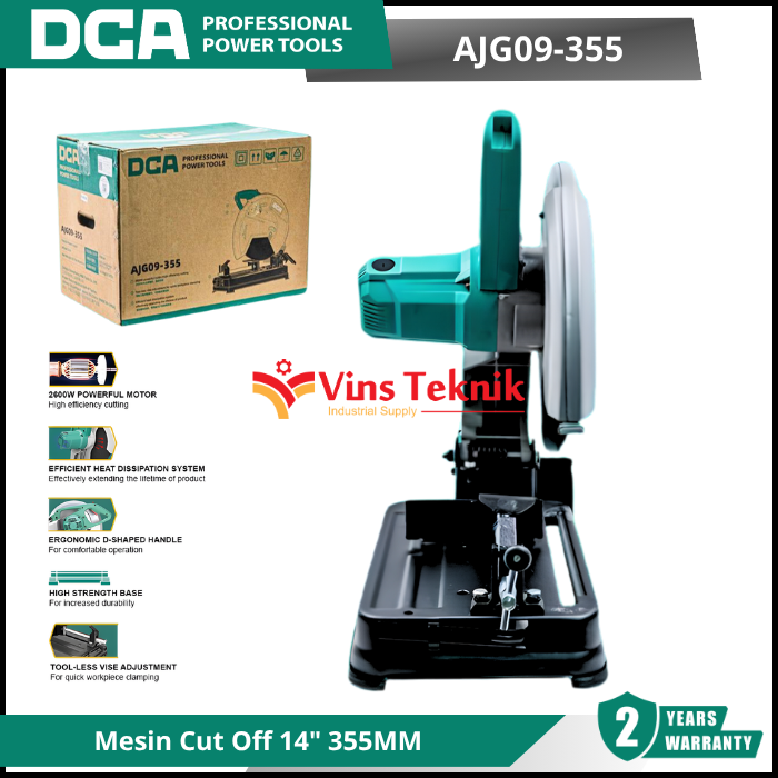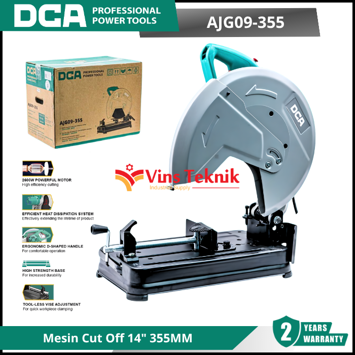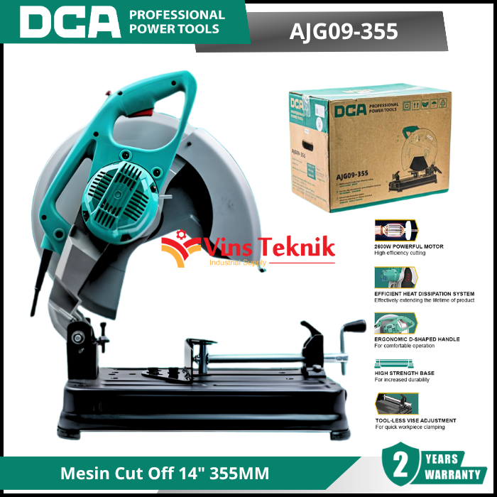 DCA AJG09-355 atau mesin potong, berfungsi untuk memotong material keras seperti logam, genteng, dan beton. Mesin ini menggunakan cakram abrasif yang berputar untuk melakukan pemotongan, mirip dengan roda gerinda, bukan mata gergaji bergigi. Cut off machine sangat berguna dalam berbagai aplikasi industri dan konstruksi untuk pemotongan presisi pada material yang panjang seperti pipa atau batang besi.