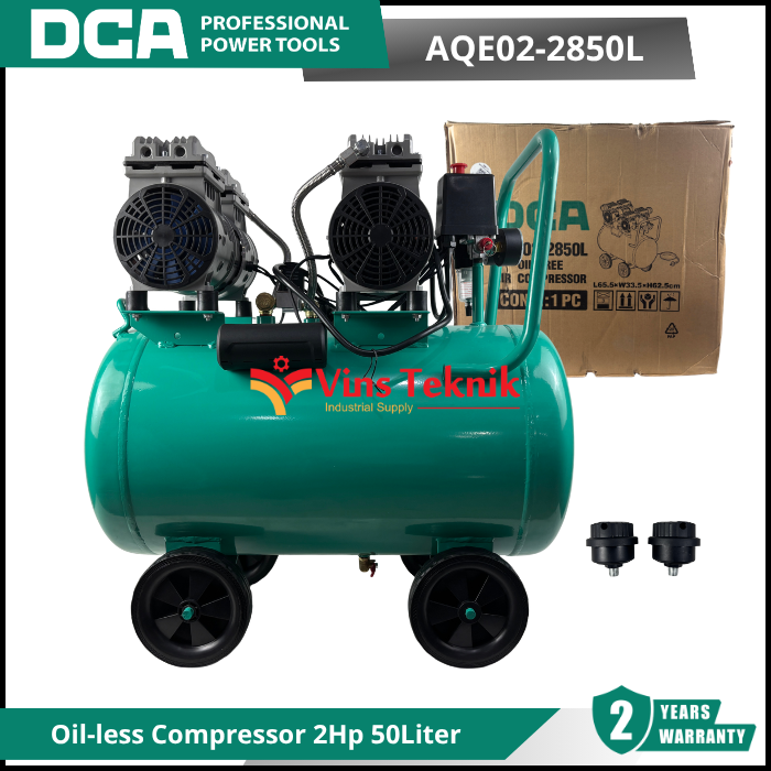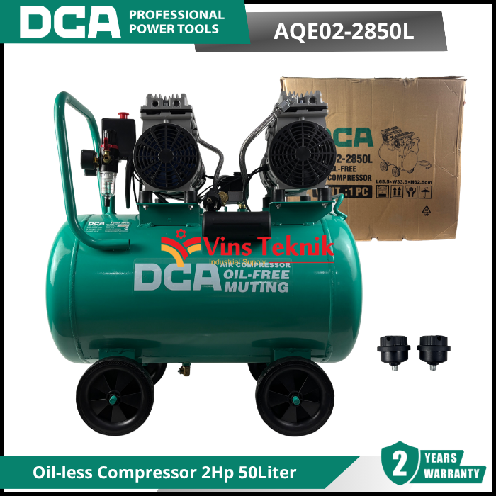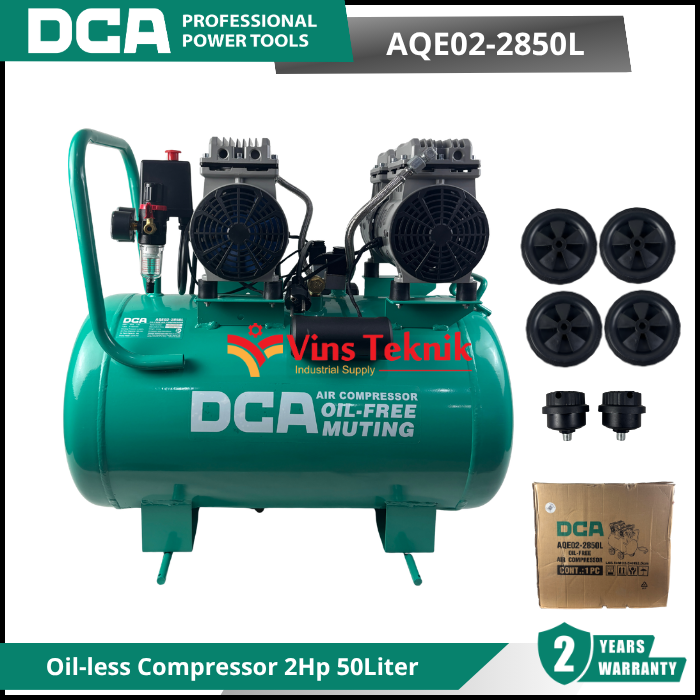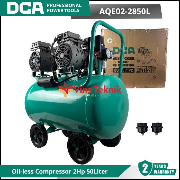 DCA AQE02-2850L adalah kompresor udara (air compressor) tipe silent dan oilless (tanpa oli) dengan daya 2 HP (1500 Watt) dan kapasitas tangki 50 liter.