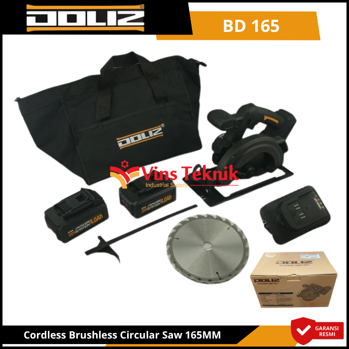 Body Ergonomis: Menggunakan lapisan... Read More Doliz BD 165 adalah mesin gergaji sirkular nirkabel (cordless circular saw) bertenaga 20V yang menggunakan teknologi Brushless Motor untuk performa lebih efisien, awet, dan bertenaga. Alat ini dirancang untuk memotong kayu dengan presisi tinggi tanpa repot dengan kabel listrik