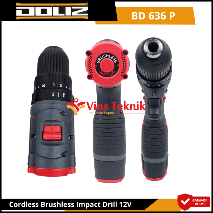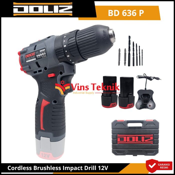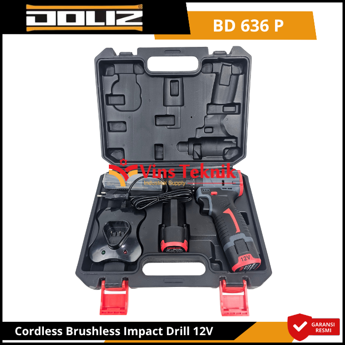 Doliz BD 636 P adalah mesin bor cordless (tanpa kabel) 12 Volt yang dilengkapi dengan fitur Impact/Hammer Drill, yang memungkinkan alat ini mengebor material keras seperti tembok atau bata ringan