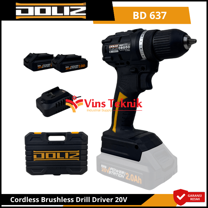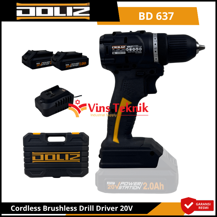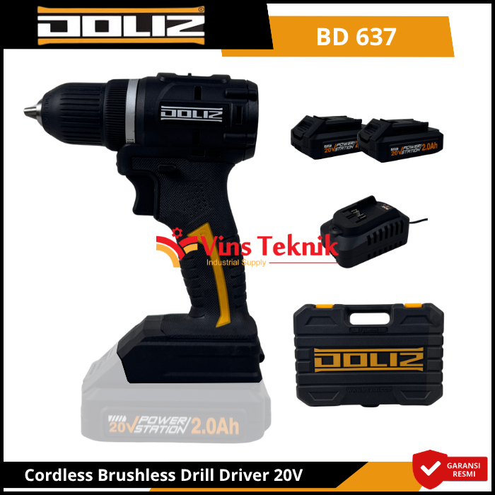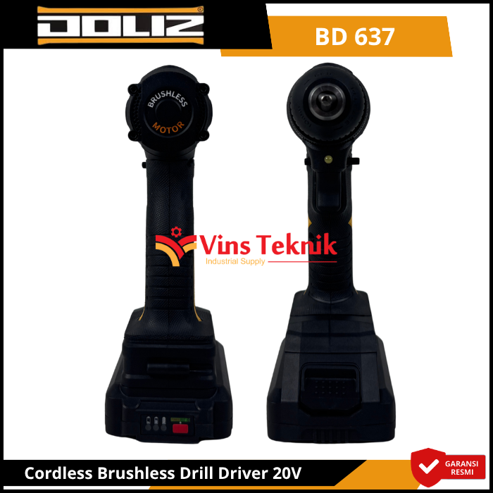 Dual Speed & Variable Speed: Dilengkapi 2 pengaturan kecepatan (Low & High) serta pelatuk... Read More Fitur utama Doliz BD637 adalah penggunaan teknologi Brushless Motor yang membuatnya lebih bertenaga, hemat baterai, dan bebas perawatan karena tidak menggunakan carbon brush. Bor cordless ini dirancang dengan bodi ringkas dan lapisan karet agar nyaman digenggam dalam waktu lama