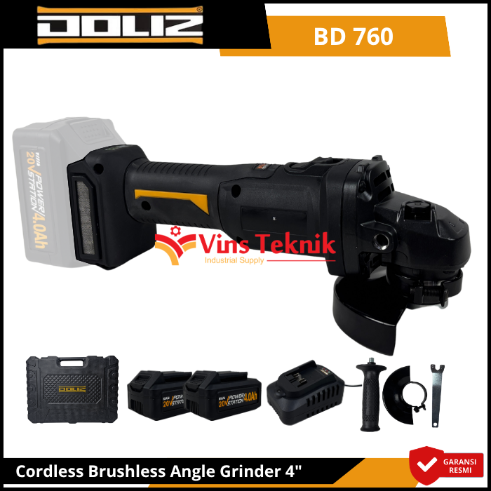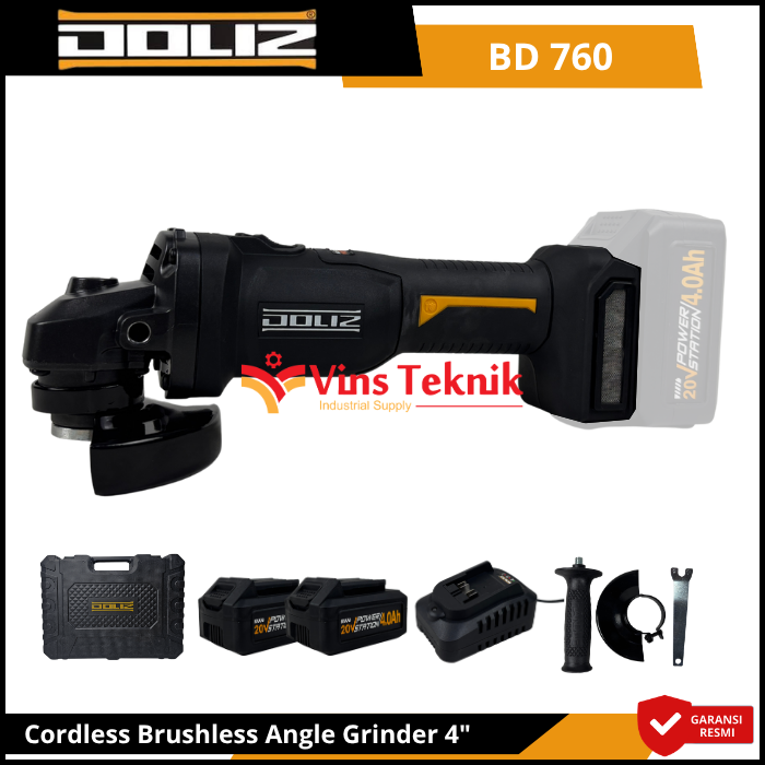 Desain Ergonomis & Kokoh: Bodi... Read More Doliz BD 760 adalah mesin gerinda tangan cordless 4 inci (100mm) bertenaga baterai 20V yang menggunakan motor brushless (tanpa sikat) untuk performa lebih awet dan bertenaga. Fitur utamanya mencakup 3 level kecepatan yang dapat diatur (sekitar 3.500–8.500 RPM), baterai 20V yang mudah dilepas, serta desain ergonomis dengan filter udara