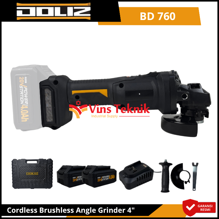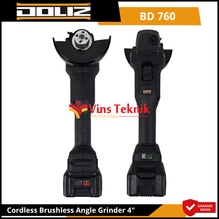Doliz BD 760 adalah mesin gerinda tangan cordless 4 inci (100mm) bertenaga baterai 20V yang menggunakan motor brushless (tanpa sikat) untuk performa lebih awet dan bertenaga. Fitur utamanya mencakup 3 level kecepatan yang dapat diatur (sekitar 3.500–8.500 RPM), baterai 20V yang mudah dilepas, serta desain ergonomis dengan filter udara