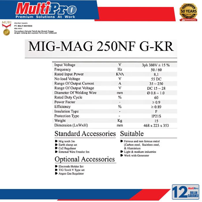 MULTIPRO MIG-MAG 250NF G-KR Mesin Las Argon 250A Mesin Las Listrik INVERTER MMA-MIG-TIG 250NF