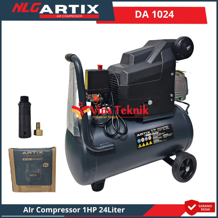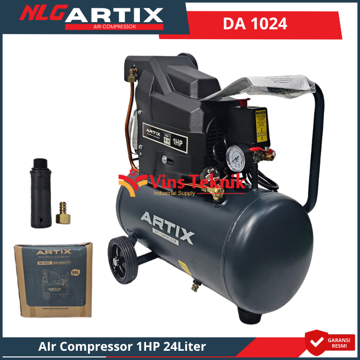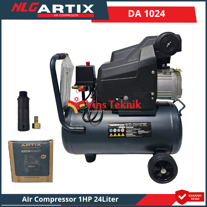 - Desain Portabel: Dilengkapi dengan roda dan pegangan untuk memudahkan pemindahan unit... Read More Artix DA 1024 adalah mesin kompresor angin listrik tipe direct driven (menggunakan oli) dengan kapasitas tangki 24 liter dan tenaga 1 HP. Alat ini dirancang untuk kebutuhan bengkel, pengecatan menggunakan spray gun, pompa ban, hingga penggunaan paku tembak (air nailer).