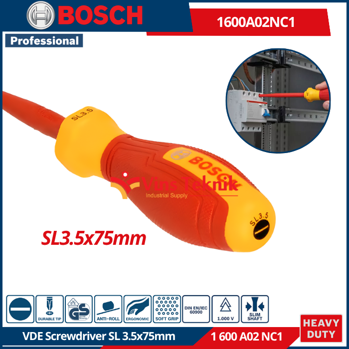 Bosch 1600A02NC1 adalah Obeng VDE SL3.5x75 mm Professional. Alat ini merupakan obeng isolasi yang dirancang khusus untuk teknisi listrik agar dapat bekerja dengan aman pada peralatan bertegangan tinggi.