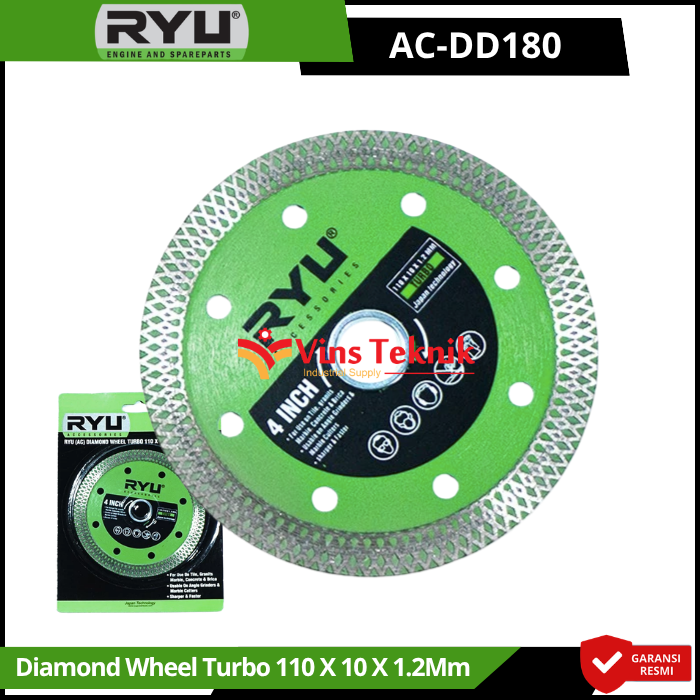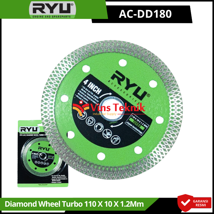 RYU AC-DD180 adalah aksesori mesin berupa Diamond Wheel Turbo (mata potong) berukuran 4 inci yang dirancang untuk pemotongan cepat pada material keras seperti keramik, granit, dan marmer