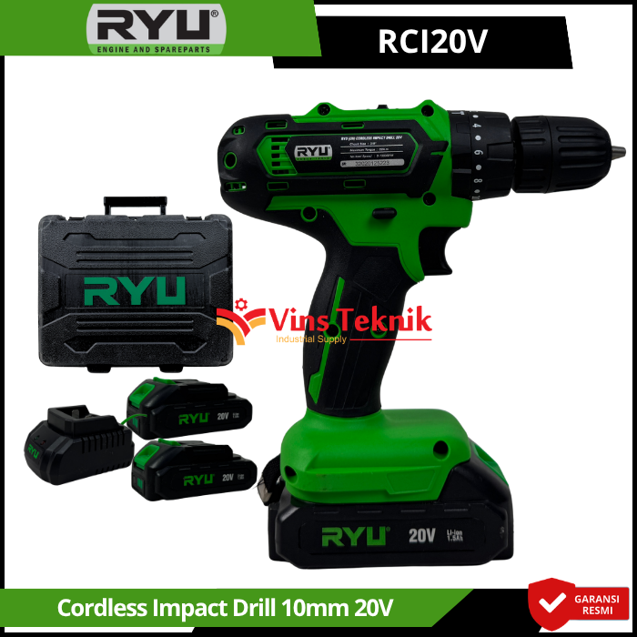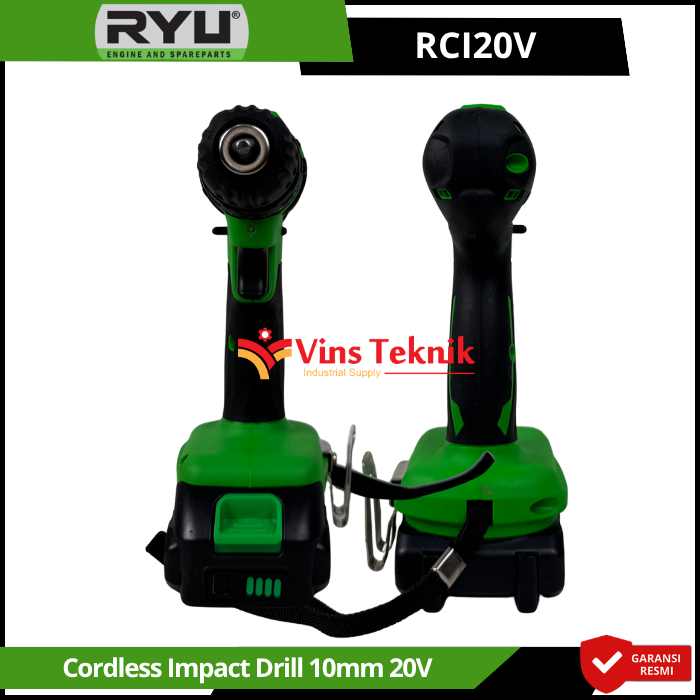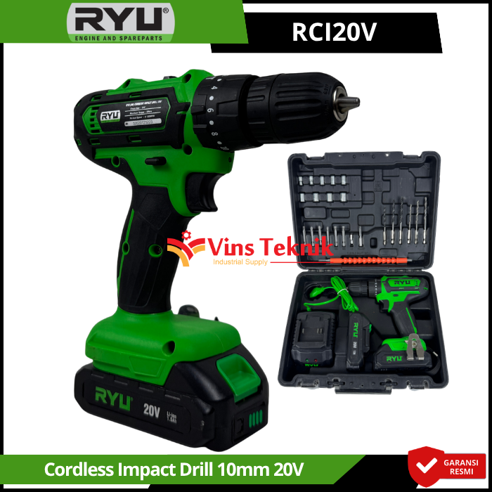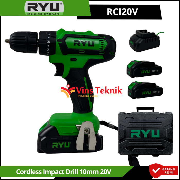 RYU RCI20V adalah mesin bor nirkabel (cordless impact drill) 20 Volt yang dirancang untuk fungsi penyekrupan, pengeboran kayu/besi, serta pengeboran tembok (mode impact)