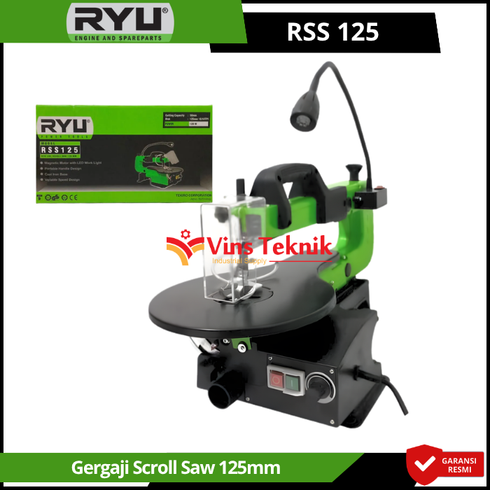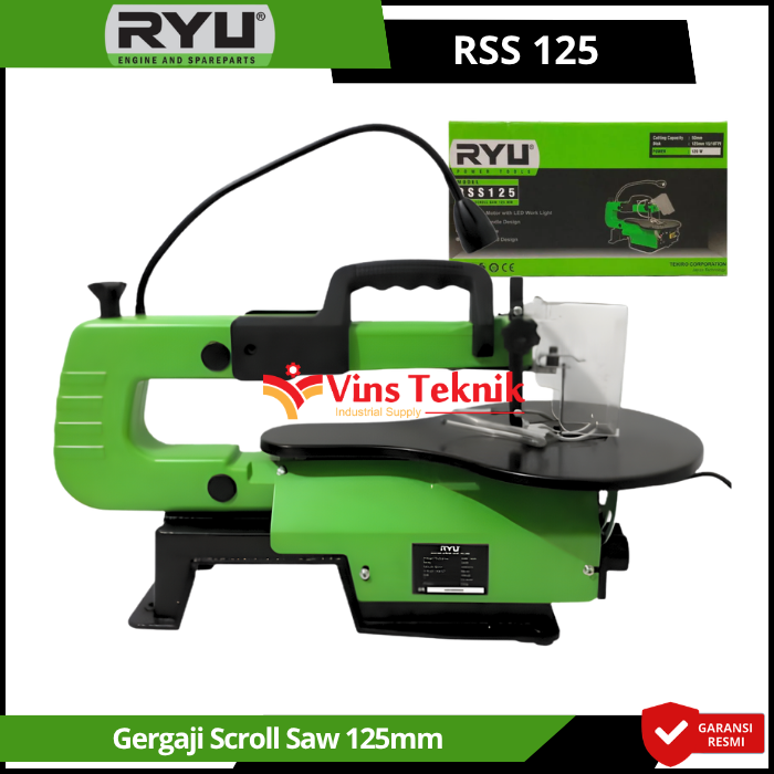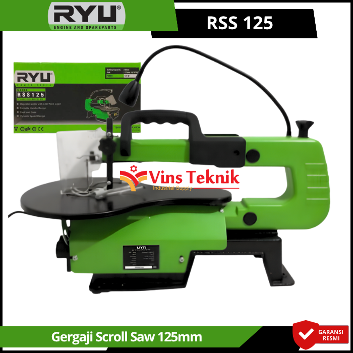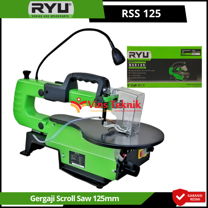 RYU RSS125 adalah mesin gergaji ukir (scroll saw) berukuran 125 mm (16 inci) yang dirancang untuk membuat potongan detail dan pola melengkung presisi pada material seperti kayu atau tripleks