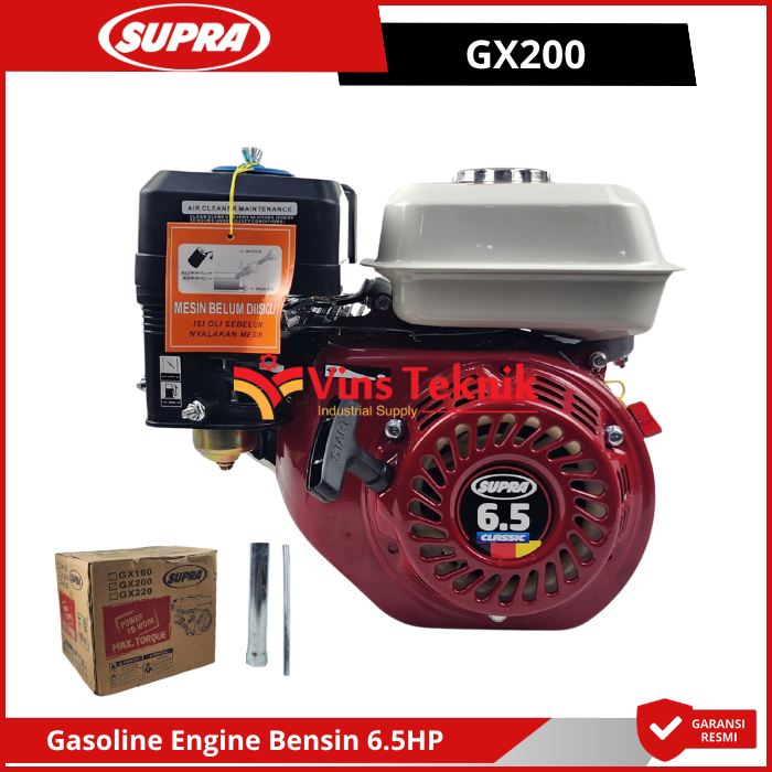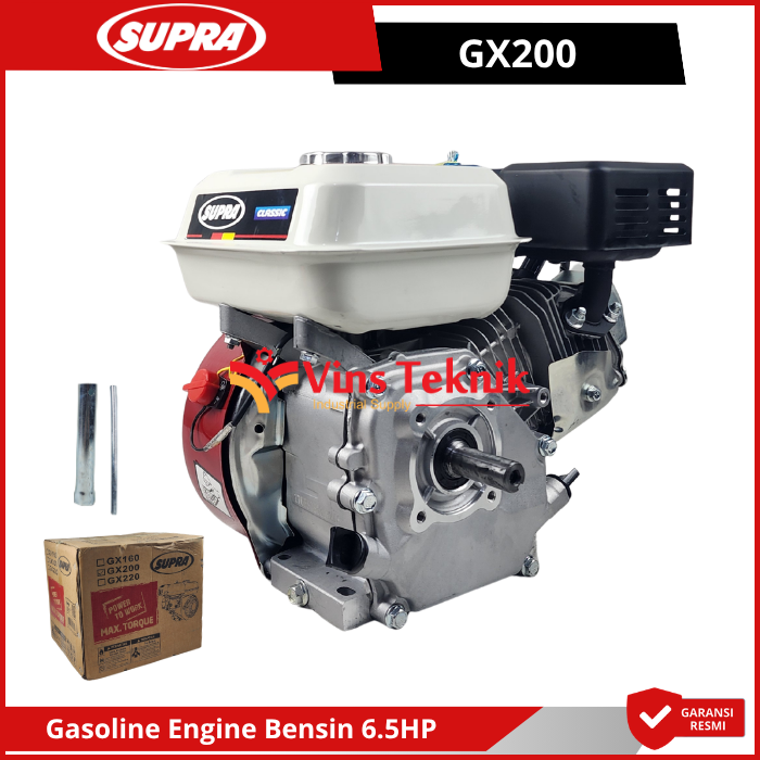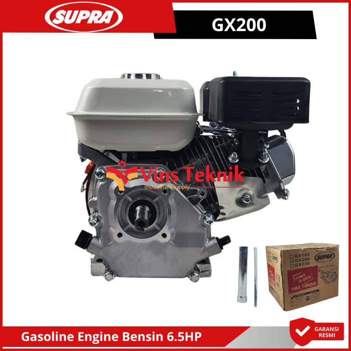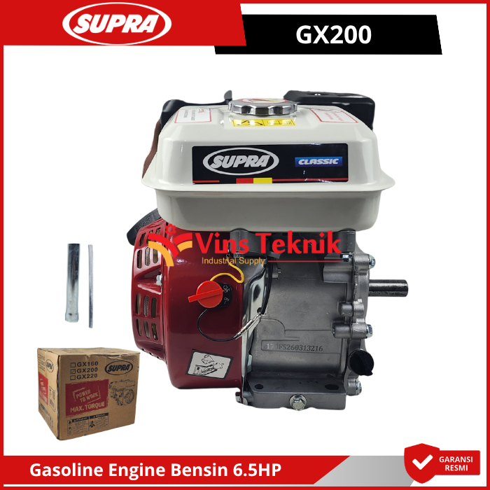 Supra GX200 adalah mesin bensin serbaguna 4-tak dengan tenaga 6.5 HP yang dirancang untuk beban kerja menengah seperti pompa air, genset, atau alat pertanian