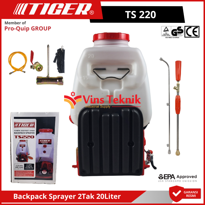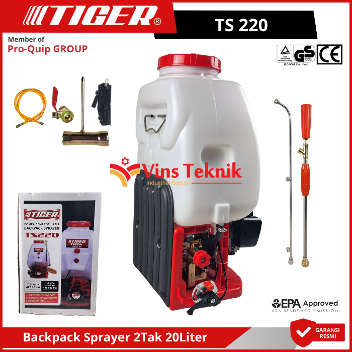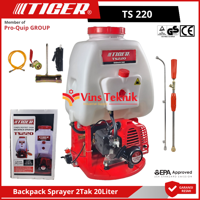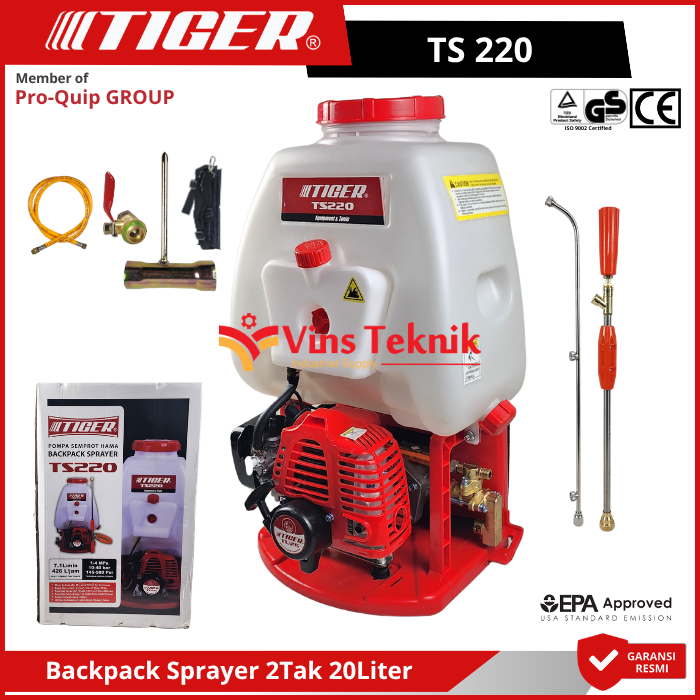 Tiger TS220 adalah mesin semprot hama bertipe backpack sprayer (gendong) yang menggunakan mesin 2-tak dengan kapasitas tangki 20 liter. Alat ini dirancang untuk penggunaan efisien di lahan pertanian maupun perkebunan guna menyemprotkan pestisida, herbisida, atau pupuk cair
