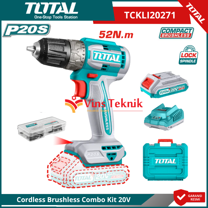 Torsi... Read More TOTAL TCKLI20271 adalah set cordless combo kit industri 20V yang terdiri dari Brushless Drill (Mesin Bor) dan Impact Wrench (Mesin Pembuka Baut) bertenaga baterai