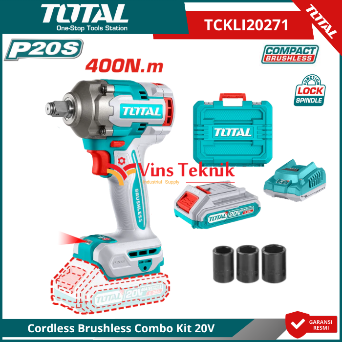 TOTAL TCKLI20271 adalah set cordless combo kit industri 20V yang terdiri dari Brushless Drill (Mesin Bor) dan Impact Wrench (Mesin Pembuka Baut) bertenaga baterai