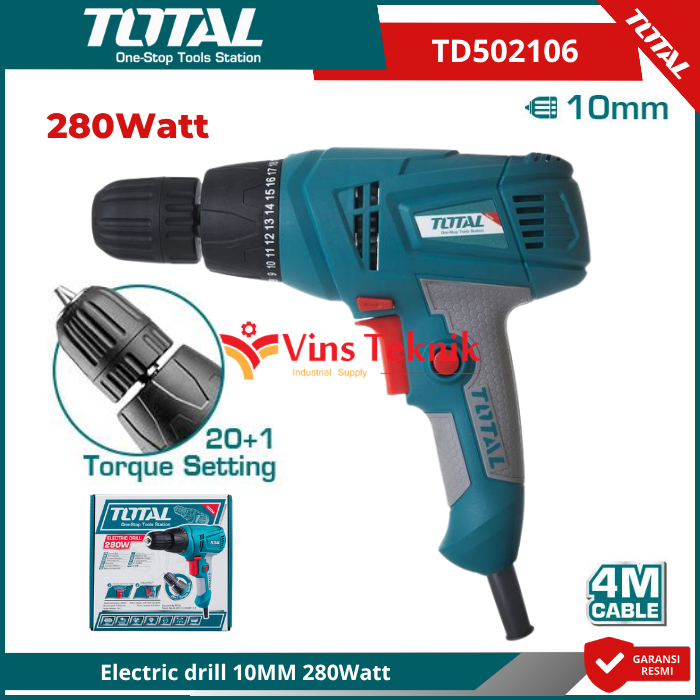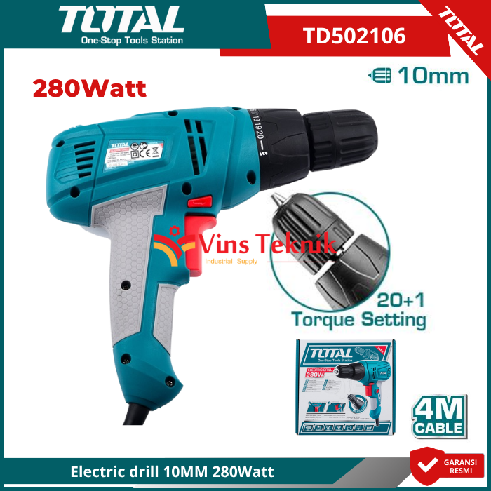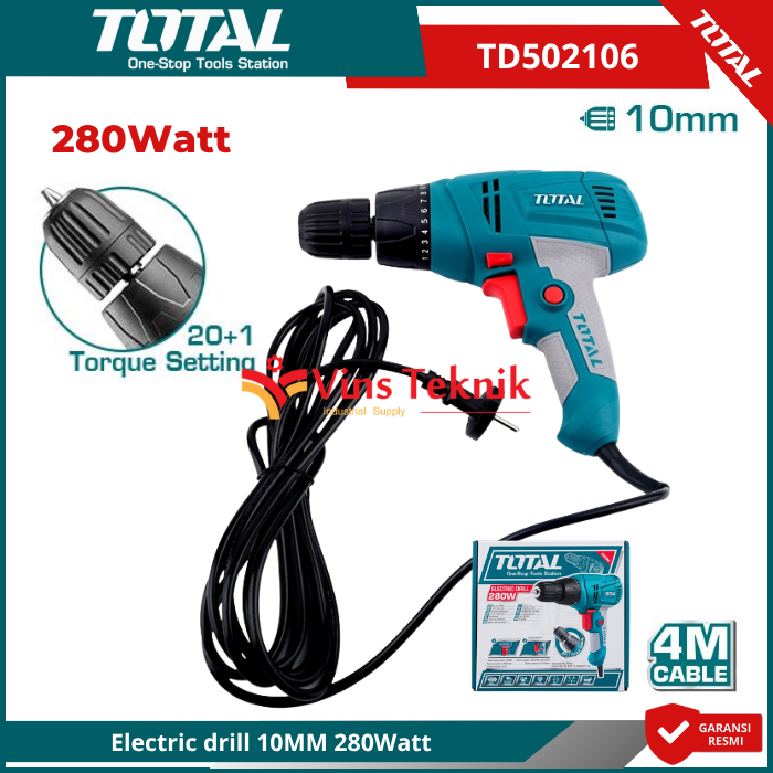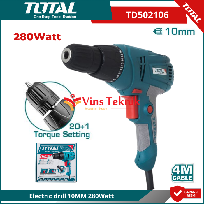 TOTAL TD502106 adalah bor listrik tangan berkapasitas 10mm dengan daya 280W yang dirancang untuk pekerjaan pengeboran ringan dan penyekrupan