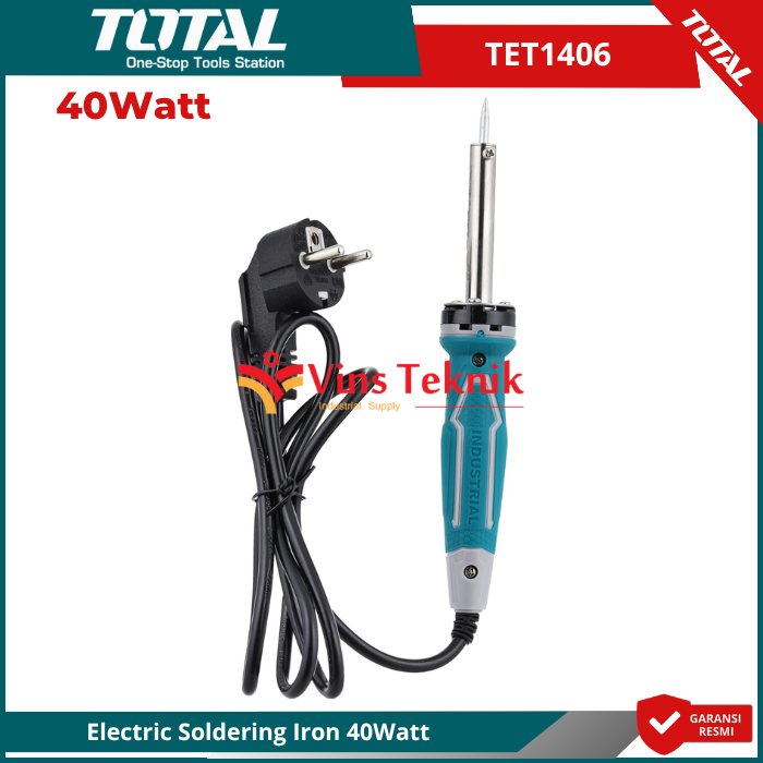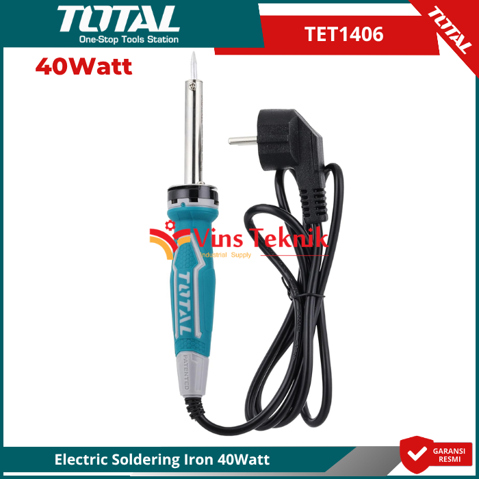 Total TET1406 adalah alat solder listrik (Electric Soldering Iron) berdaya 40 Watt yang dirancang untuk pekerjaan elektronika presisi dan perbaikan papan sirkuit. Alat ini dikenal karena kemampuannya memanas dengan cepat dan memiliki desain yang ergonomis