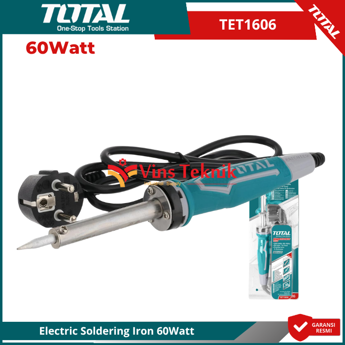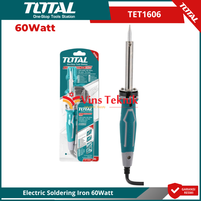 TOTAL TET1606 adalah alat solder tipe stik (straight tip) dengan daya 60 Watt yang dirancang untuk penggunaan industrial maupun hobi