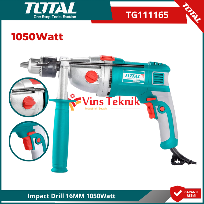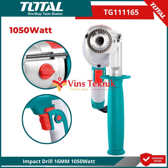 Ergonomic Design... Read More TOTAL TG111165 adalah mesin bor dampak (impact drill) listrik kelas industrial dengan daya 1050 Watt. Alat ini dirancang untuk menangani pekerjaan berat seperti melubangi beton, logam, dan kayu dengan dua pilihan kecepatan mekanis