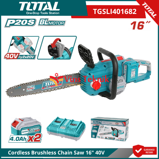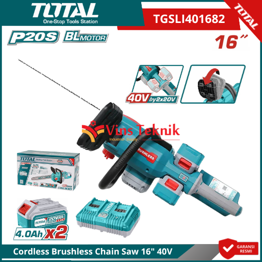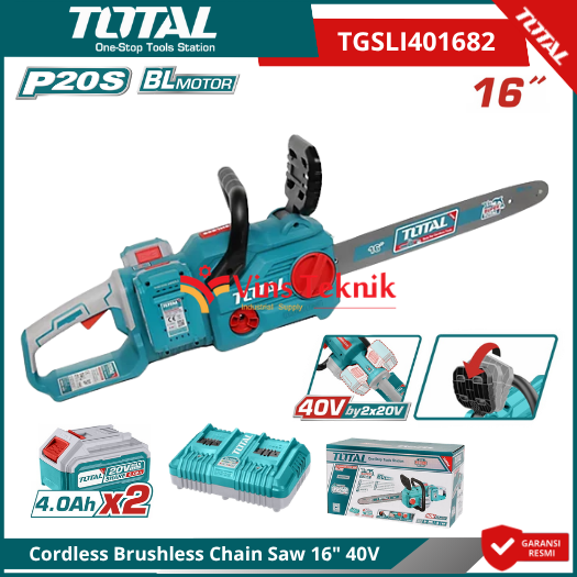 TOTAL TGSLI401682 adalah gergaji mesin nirkabel (cordless chain saw) profesional yang ditenagai oleh sistem baterai ganda 40V. Alat ini menggunakan teknologi motor brushless untuk performa yang lebih efisien dan tahan lama tanpa perlu penggantian carbon brush
