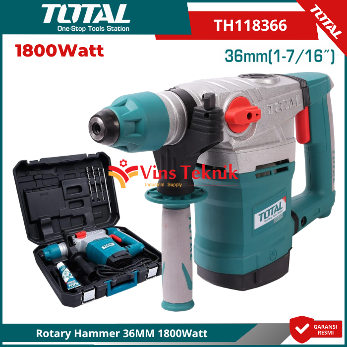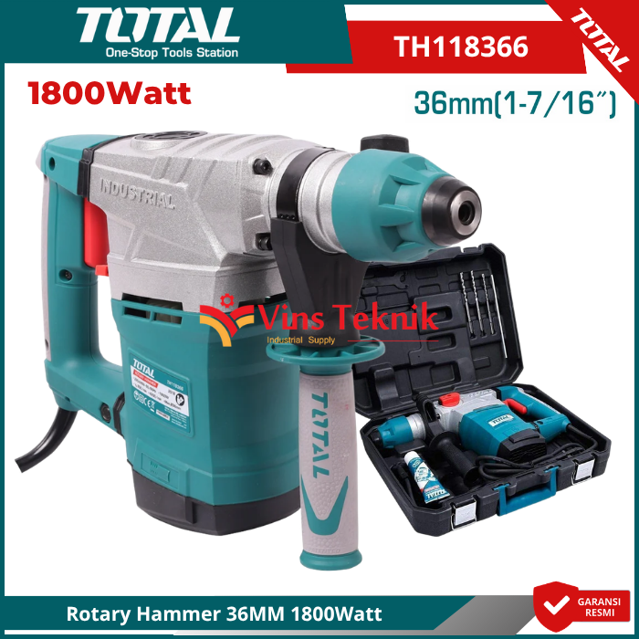 Kecepatan Pukulan (Impact Rate) : 4200... Read More TOTAL TH118366 adalah mesin bor Rotary Hammer berperforma tinggi yang dirancang untuk pekerjaan berat seperti pengeboran beton, pembongkaran, dan pemahatan