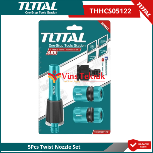 TOTAL THHCS05122 adalah set aksesori selang taman berisi 5 komponen (5-piece twist nozzle set) yang dirancang untuk memudahkan penyambungan dan pengaturan aliran air