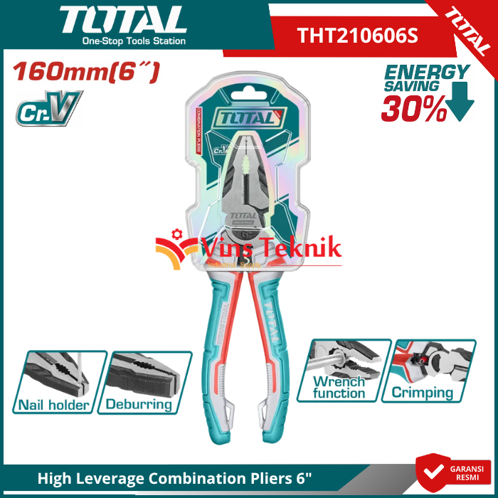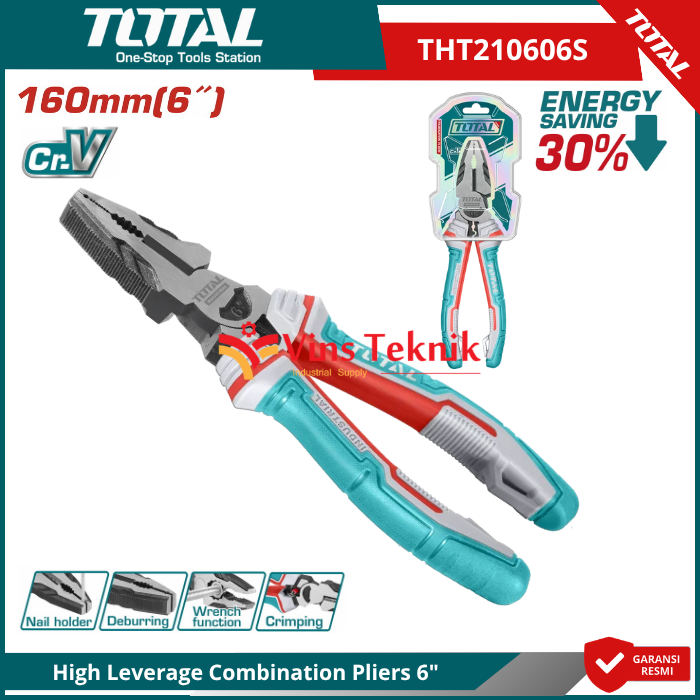TOTAL THT210606S adalah tang kombinasi 6 inci (160mm) dengan desain High Leverage yang dirancang untuk memberikan tenaga potong dan jepit lebih besar dengan tenaga minimal