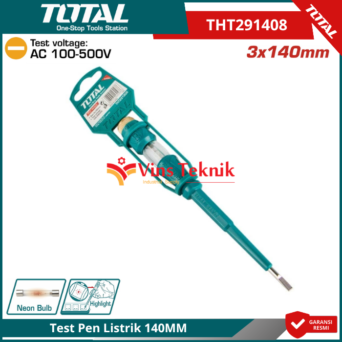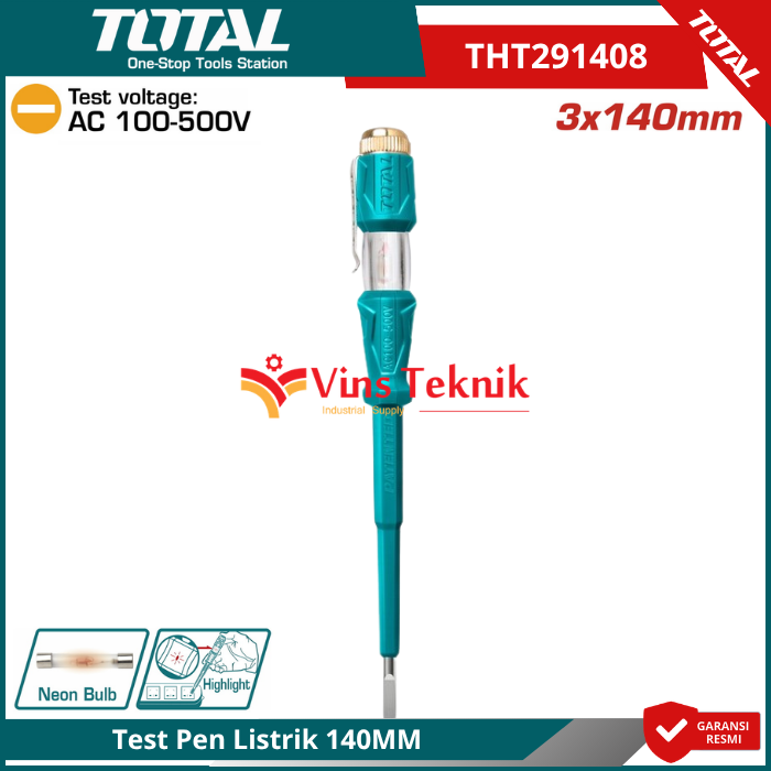 TOTAL THT291408 adalah tespen (test pencil) praktis yang dirancang untuk mendeteksi keberadaan tegangan listrik AC secara cepat dan aman. Alat ini berfungsi sebagai indikator tegangan sekaligus dapat digunakan sebagai obeng minus (slotted) kecil untuk pekerjaan ringan