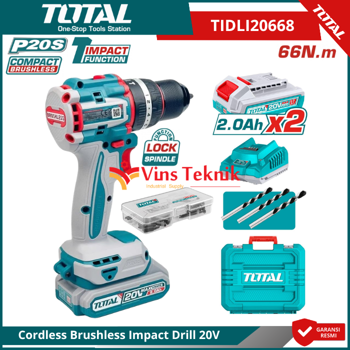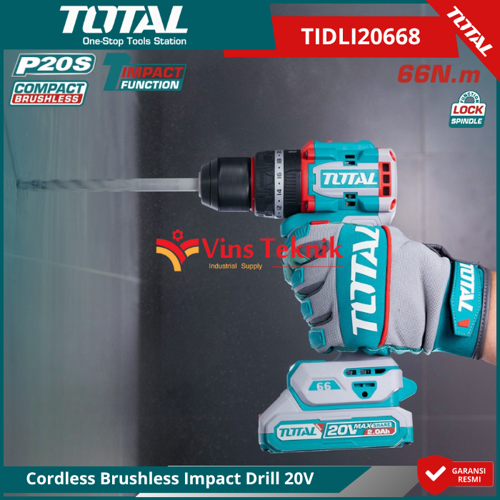 TOTAL TIDLI20668 adalah mesin bor impact baterai (cordless) kelas industri yang menggunakan teknologi motor Brushless (tanpa sikat karbon), sehingga lebih awet dan bertenaga