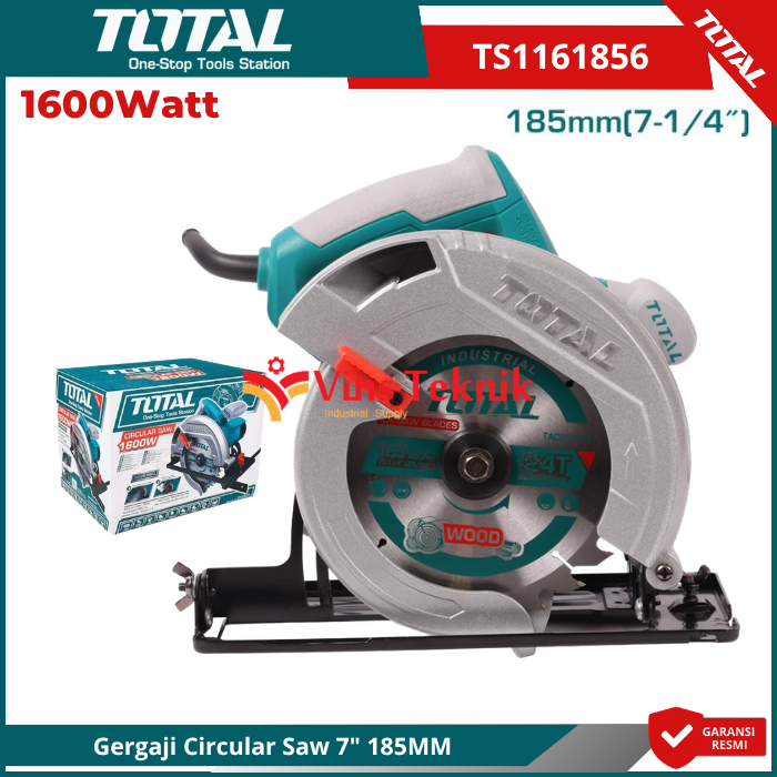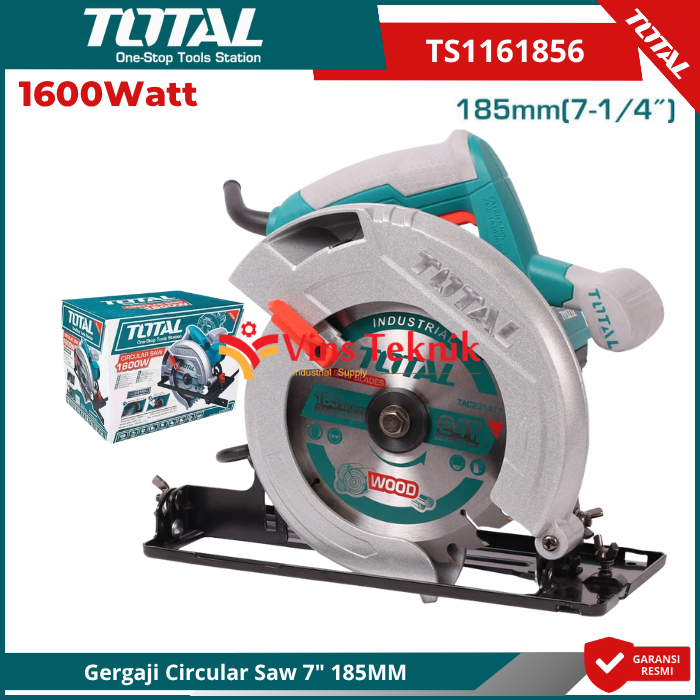 (Circular Saw) Total TS1161856 adalah alat pertukangan bertenaga 1600 Watt yang dirancang untuk pemotongan kayu secara lurus dan presisi dalam skala industri maupun rumah tangga