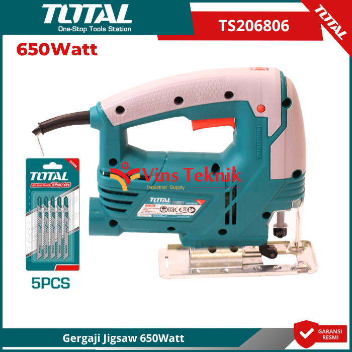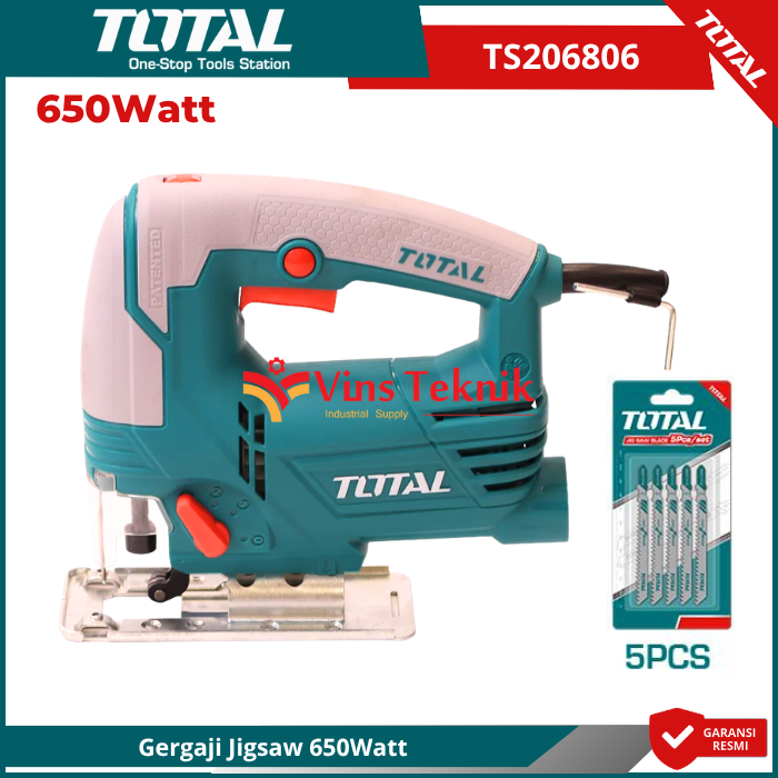 Aluminum Base Plate : Menggunakan pelat dasar aluminium yang kokoh untuk menjaga kestabilan... Read More Total TS206806 adalah gergaji ukir (jigsaw) bertenaga 650W yang dirancang untuk penggunaan profesional maupun hobi (DIY) dengan fitur utama berupa pengaturan kecepatan dan aksi pendulum untuk hasil potong yang lebih efisien