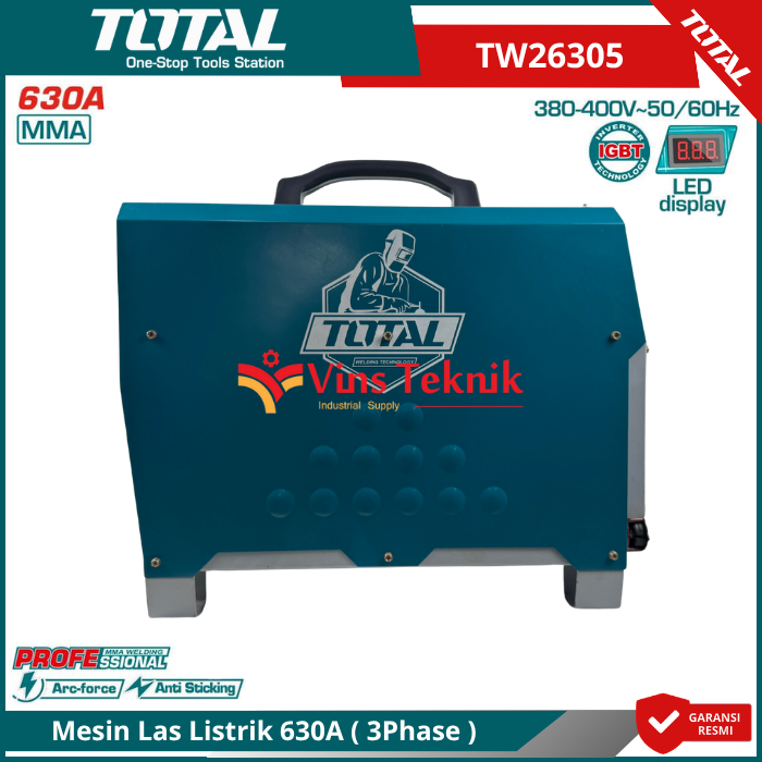 TOTAL TW26305 adalah mesin las listrik jenis Inverter MMA630 yang dirancang untuk penggunaan industri dengan kapasitas besar