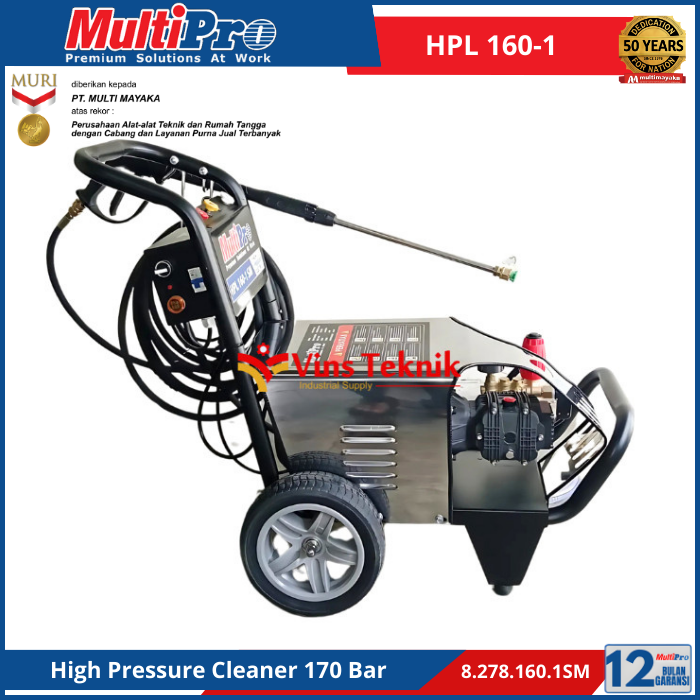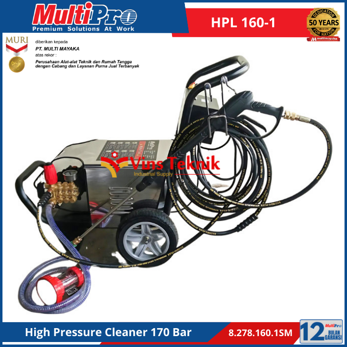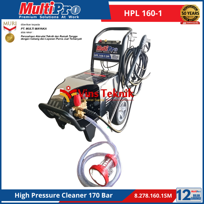 Type Sku : HPL... Read More MULTIPRO HPL 160-1 SM adalah high pressure washer elektrik kelas tugas berat (heavy duty) yang dirancang untuk membersihkan kotoran membandel dengan tekanan air hingga 170 Bar. Mesin ini cocok untuk penggunaan industri ringan, rumah tangga, dan lingkungan luar ruangan.