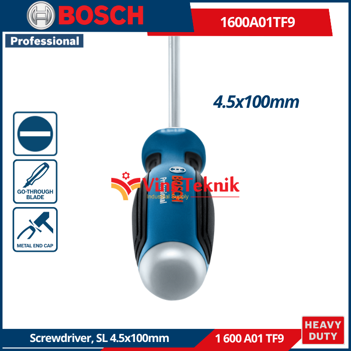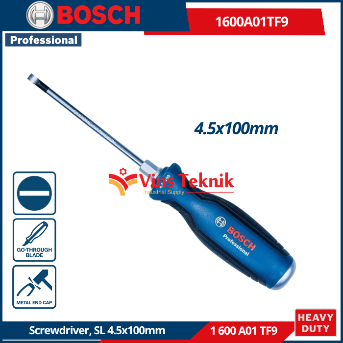 - Hexagonal Bolster : Memiliki bagian segi enam (heksagonal) pada batang di... Read More BOSCH 1600A01TF9 adalah kode produk untuk Bosch Professional Slotted Screwdriver SL 4.5 x 100mm (Obeng Minus)