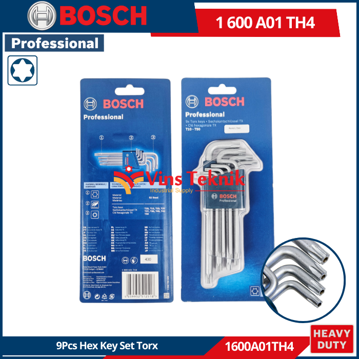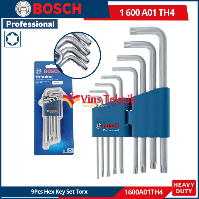 BOSCH 1 600 A01 TH4 adalah set kunci allen Torx 9 buah profesional yang terbuat dari baja S2 yang dikeraskan untuk daya tahan optimal.