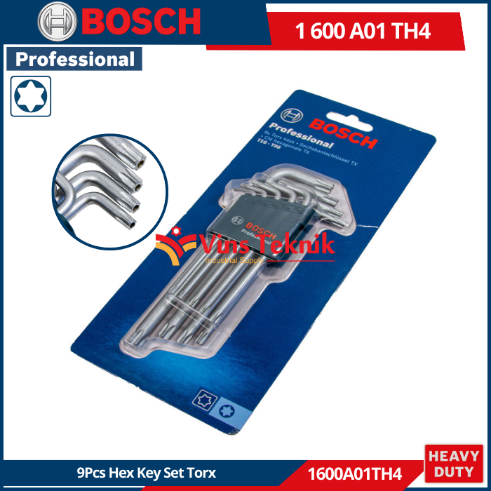 - Kemasan: Kunci-kunci tersebut dikemas dalam wadah yang mudah diakses, membantu identifikasi... Read More BOSCH 1 600 A01 TH4 adalah set kunci allen Torx 9 buah profesional yang terbuat dari baja S2 yang dikeraskan untuk daya tahan optimal.