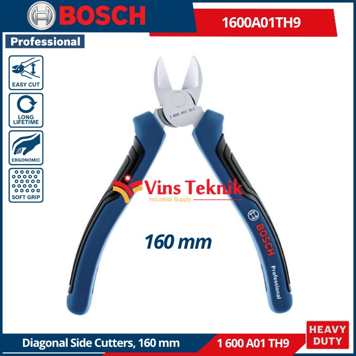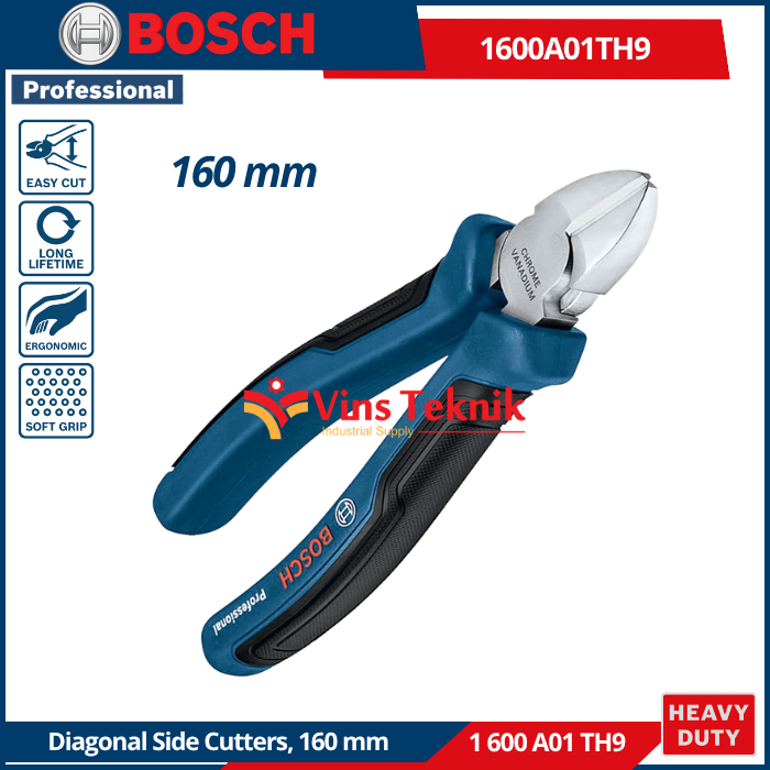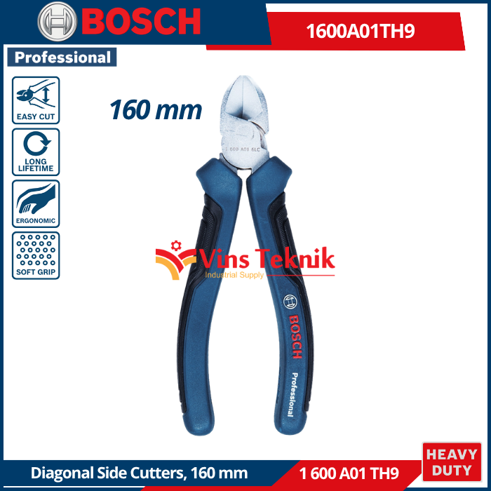 BOSCH 1600A01TH9 adalah kode produk untuk Bosch Professional Diagonal Side Cutter 160mm (Tang Potong Diagonal). Alat ini dirancang untuk penggunaan profesional berat dengan fokus pada kekuatan potong dan kenyamanan.