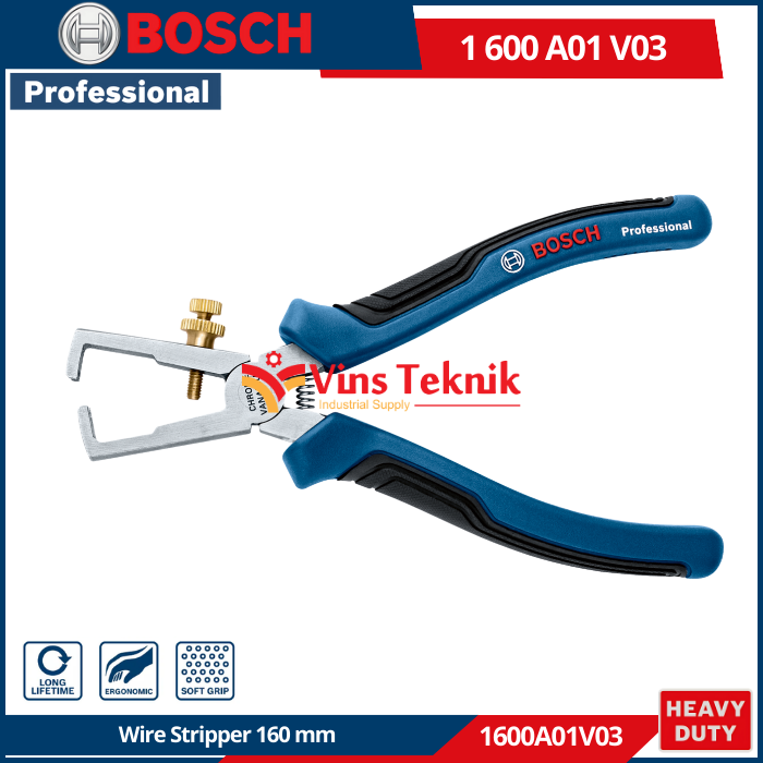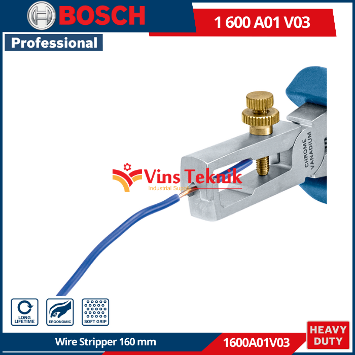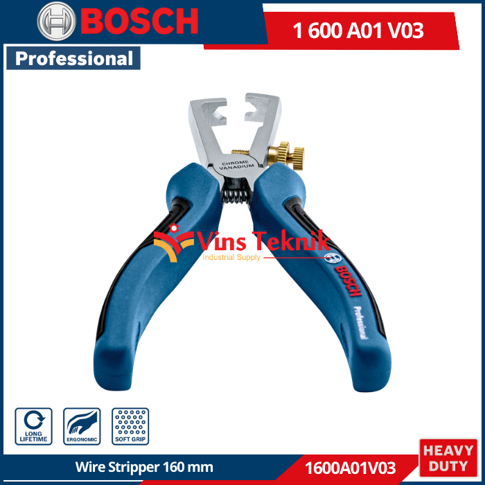 - Bahan: Baja krom vanadium (Chromium-Vanadium... Read More BOSCH 1600A01V03 adalah tang pengupas kabel profesional berukuran 160 mm yang dirancang untuk penggunaan harian dan dapat mengupas kabel berdiameter hingga 10 mm².
