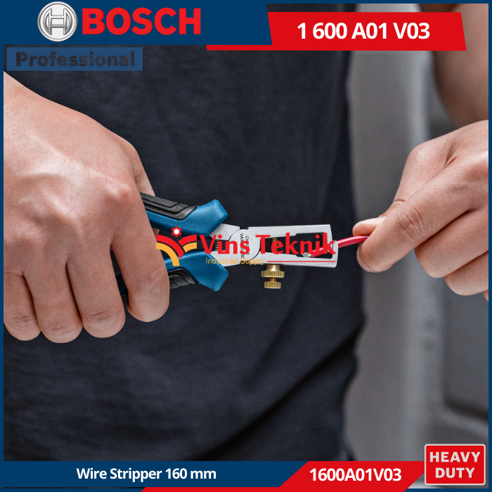 BOSCH 1600A01V03 adalah tang pengupas kabel profesional berukuran 160 mm yang dirancang untuk penggunaan harian dan dapat mengupas kabel berdiameter hingga 10 mm².