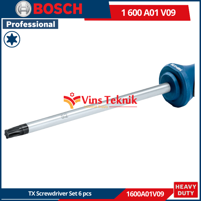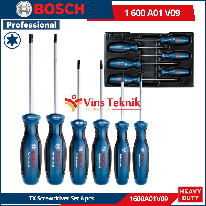 BOSCH 1 600 A01 V09 adalah set obeng Torx 6 buah (6-piece Torx screwdriver set) dari Bosch Professional. Set ini dirancang untuk penggunaan profesional dengan fitur-fitur yang berfokus pada daya tahan dan kenyamanan.