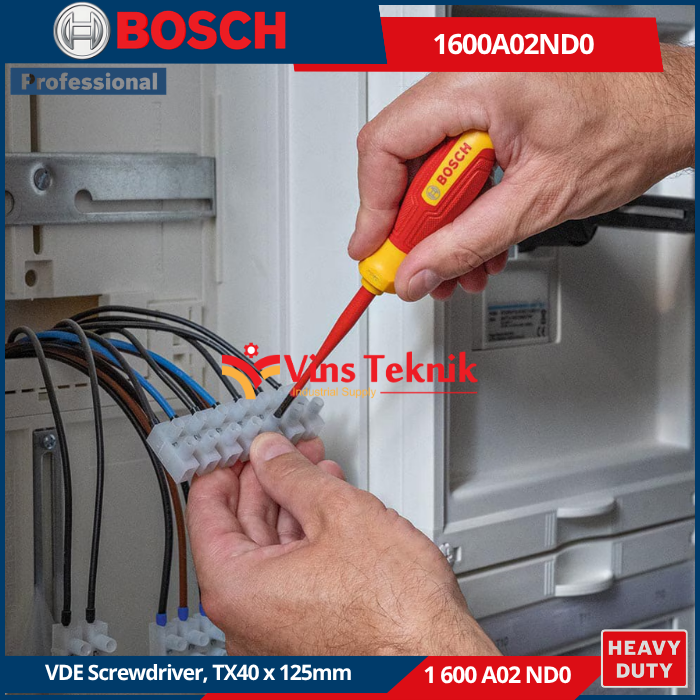 - Sertifikasi Keamanan... Read More BOSCH 1 600 A02 ND0 adalah Obeng VDE Torx TX40 x 125 mm Professional. Alat ini dirancang khusus untuk pekerjaan kelistrikan profesional, memberikan perlindungan maksimal saat menangani komponen bertegangan tinggi.