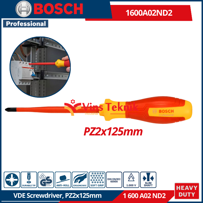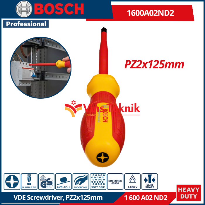 - Material : Baja... Read More Bosch 1600A02ND2 adalah obeng VDE Slotted (Pozidriv) PZ2x125mm dari lini Professional. Sama seperti seri sebelumnya, obeng ini dirancang untuk keamanan maksimal pada pekerjaan kelistrikan.