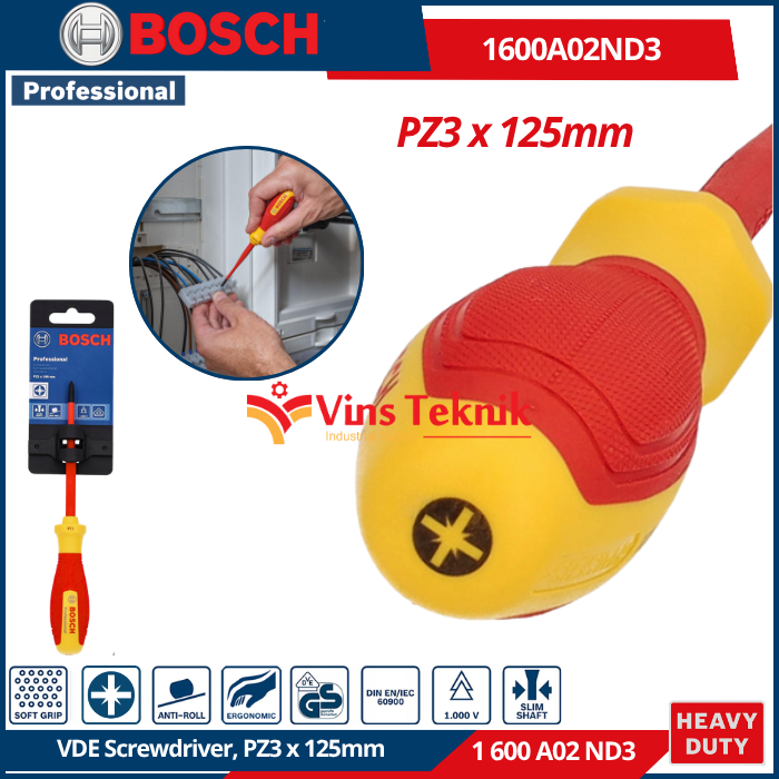 BOSCH 1 600 A02 ND3 adalah Obeng VDE Pozidriv PZ3 x 125 mm Professional. Alat ini merupakan obeng berinsulasi yang dirancang untuk memberikan keamanan maksimal bagi tenaga profesional saat menangani instalasi listrik bertegangan tinggi.