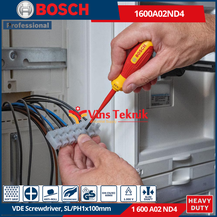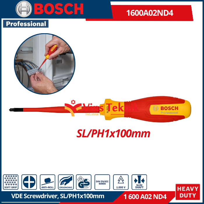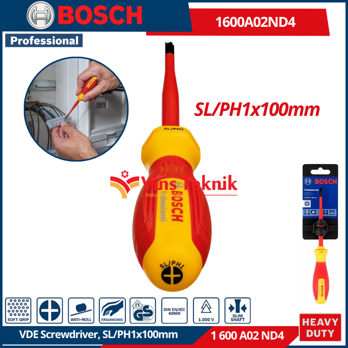 BOSCH 1 600 A02 ND4 adalah VDE Screwdriver SL/PH 1 x 100mm, sebuah obeng terisolasi yang dirancang khusus untuk pekerjaan kelistrikan profesional.